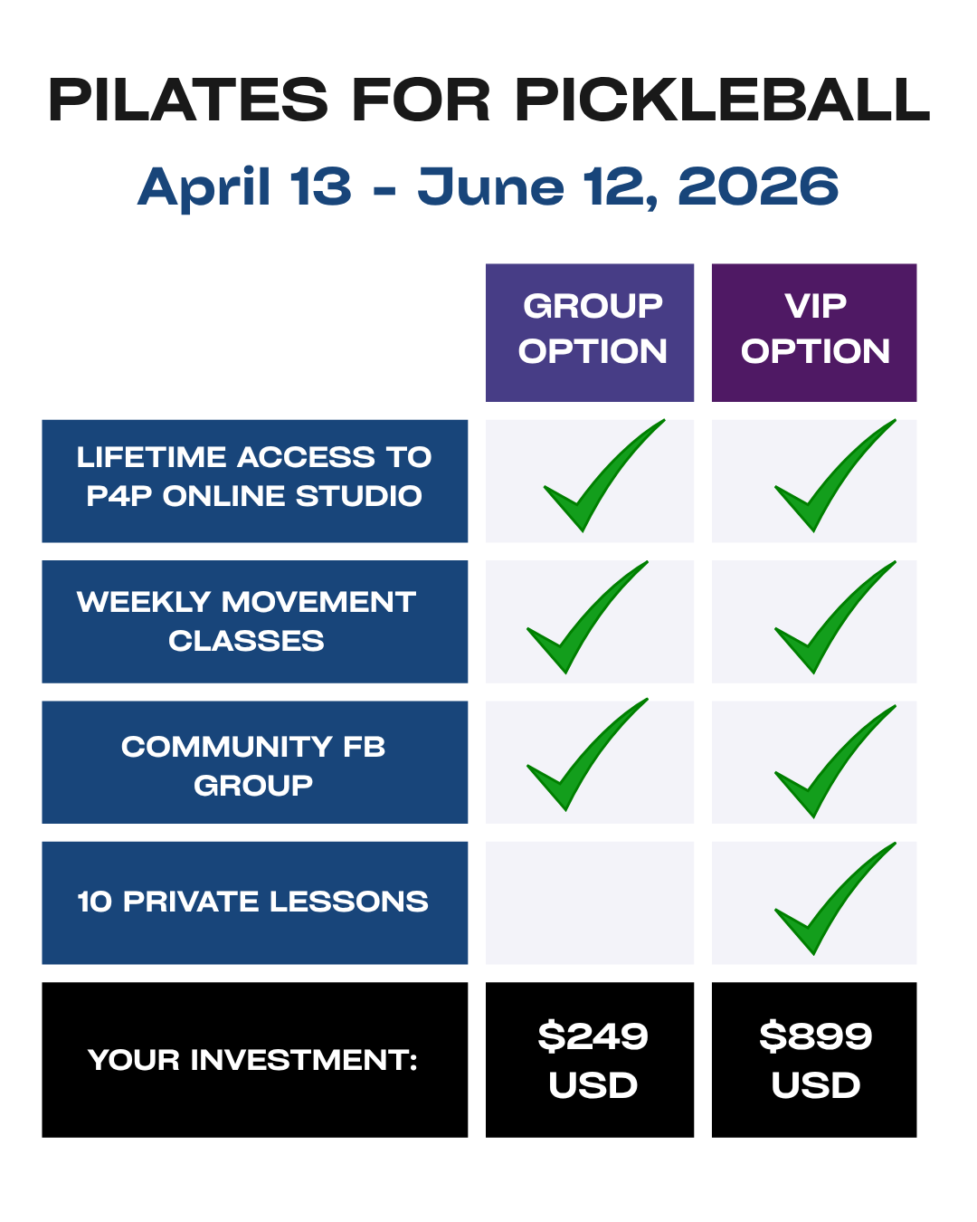 You have 2 investment options for the Pilates for Pickleball Program 👇